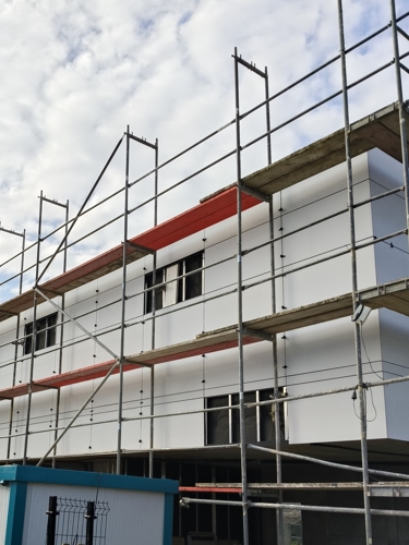 Una vez instalado el material aislante, se colocan con precisión las piezas que forman la fachada de la vivienda
