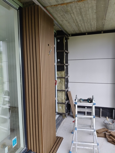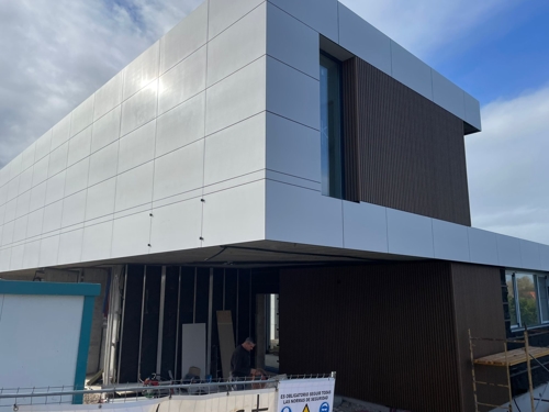 Una vez instalado el material aislante, se colocan con precisión las piezas que forman la fachada ventilada de la vivienda